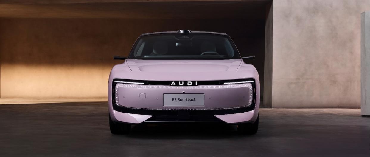 经过奥迪总部风洞实验室的考验,奥迪E5 Sportback的身姿充满着丰盈和流动质感的美。整个前脸在将奥迪油车家族式的多边形中网幻化成了布满圆润集成灯光模块的一体式格栅“大嘴”,这是奥迪向中国市场学习和融合之